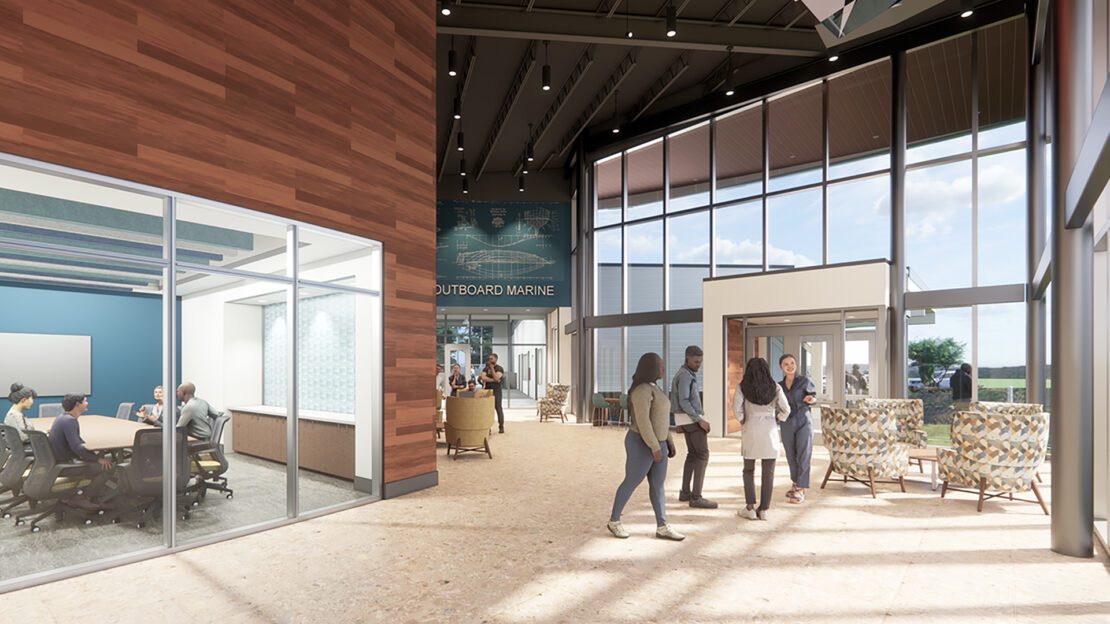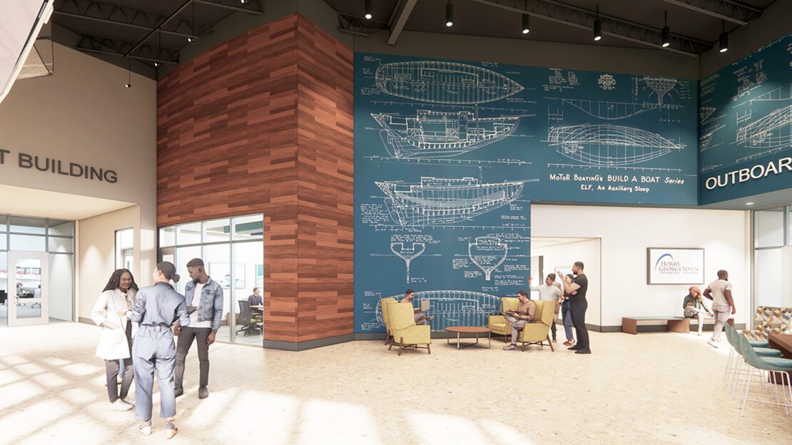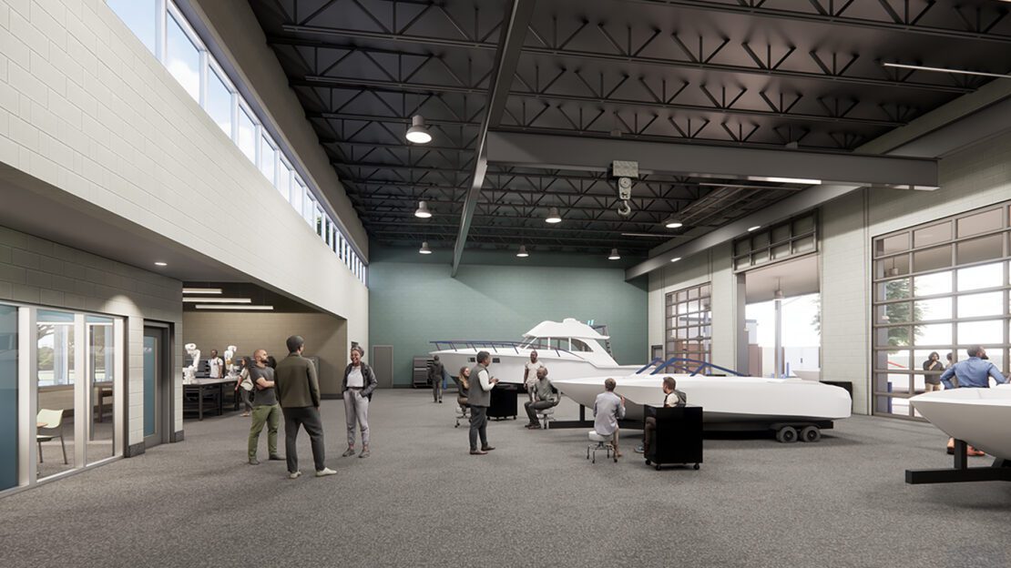 The HGTC Marine Technology Center is the only training facility of its type in the state as part of an initiative to provide a much-needed workforce curriculum. The 25,000 SF facility houses a Boat Building Lab, Outboard Motor Maintenance Lab, and classrooms and support spaces, including a lamination/painting booth and observation areas.
